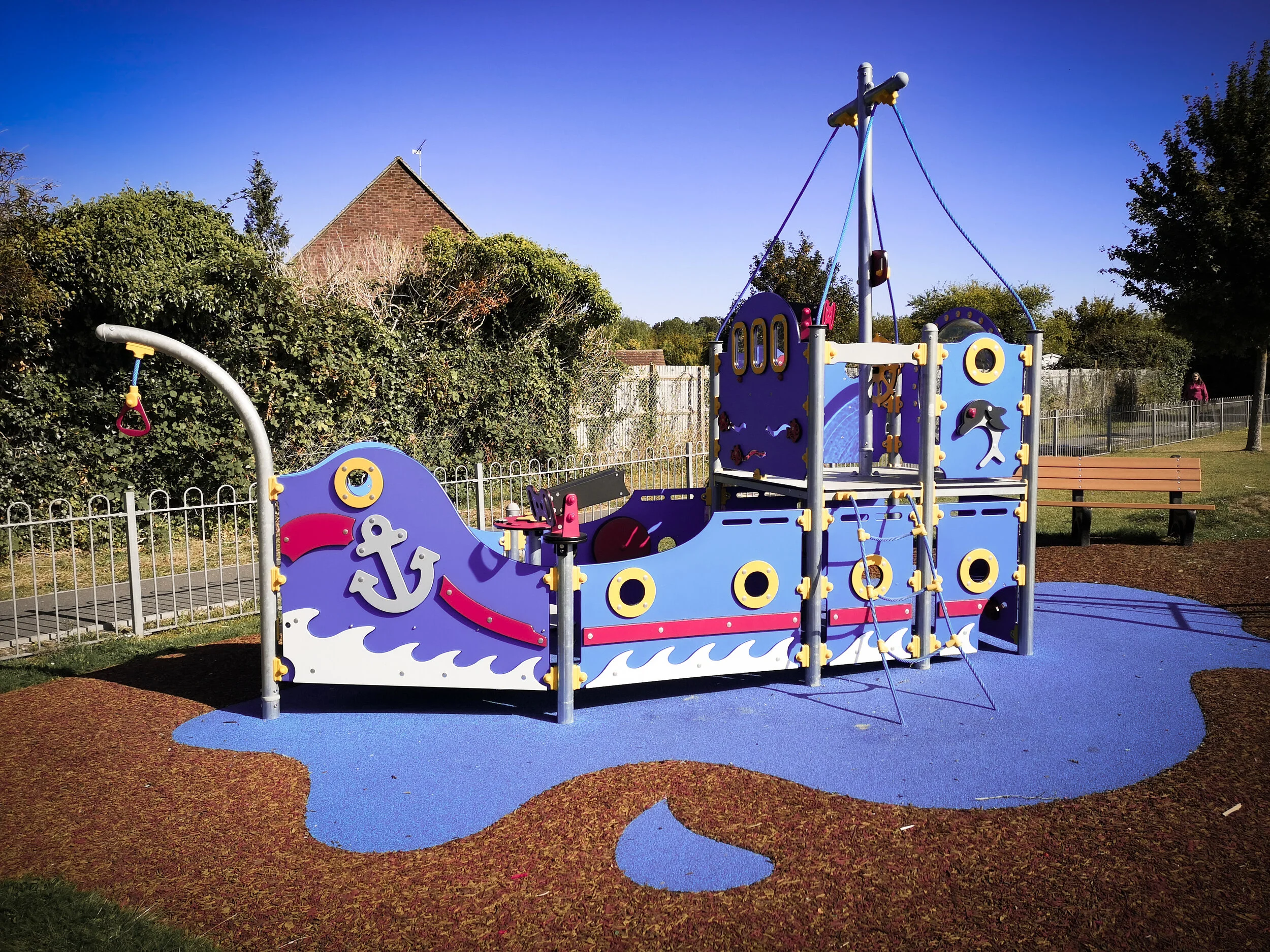 Pirate Ship climbing frame with rope ladder but also a contained ground floor to make it easy for younger kids.